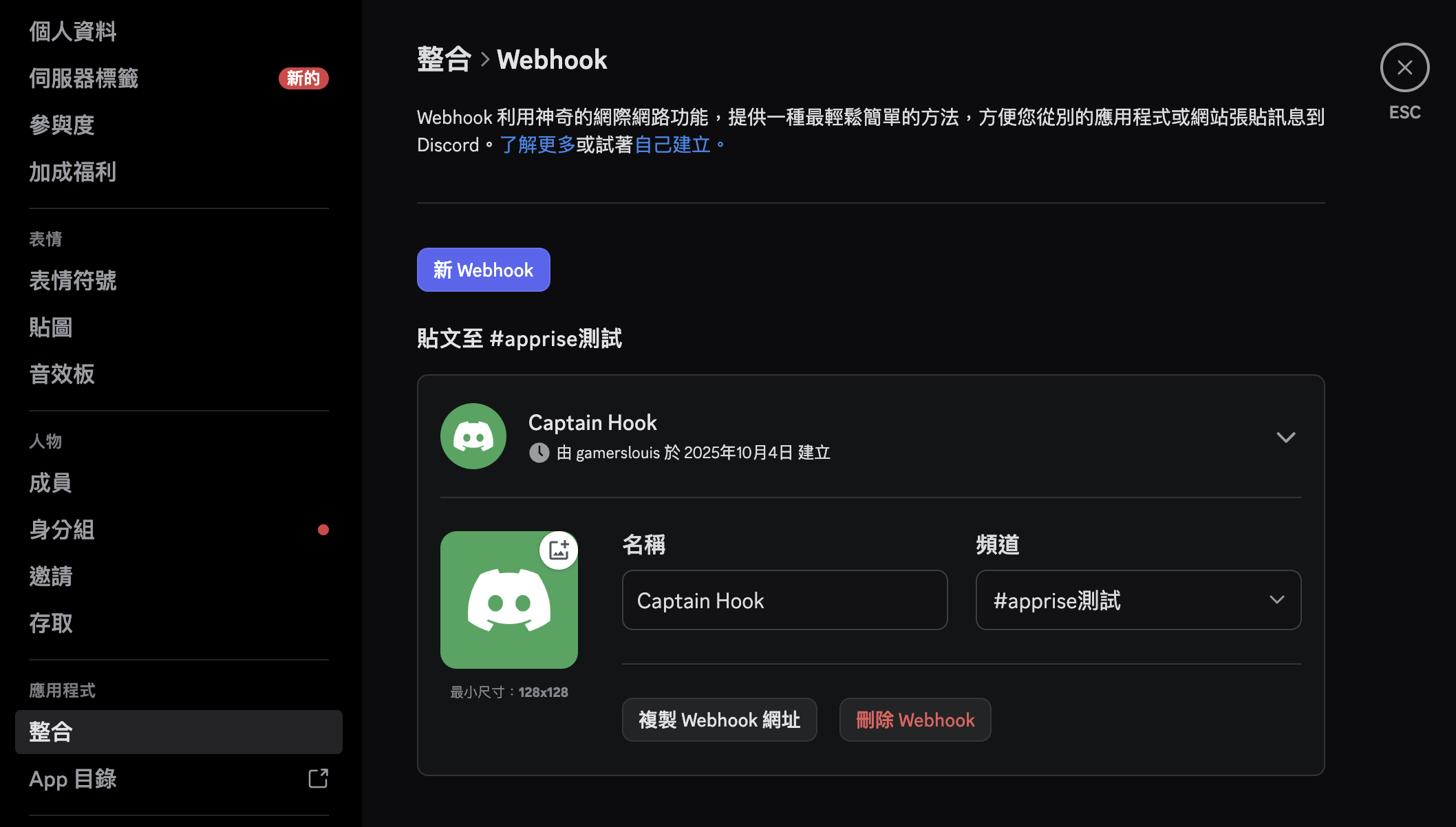 首先,點開伺服器設定 ,找到整合/Webhook,點擊新 Webhook,就可以建立一個 bot 然後設定他要發送到哪一個頻道。
