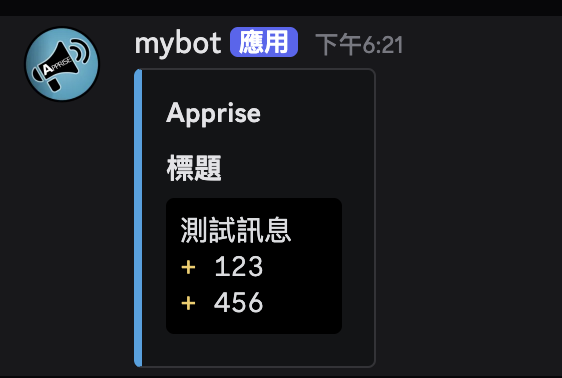 apprise -b '測試訊息' 'discord://mybot/3337232384238212/tFsNJEFEIFWFDOEW81-VJwEIQOQO8PO'
