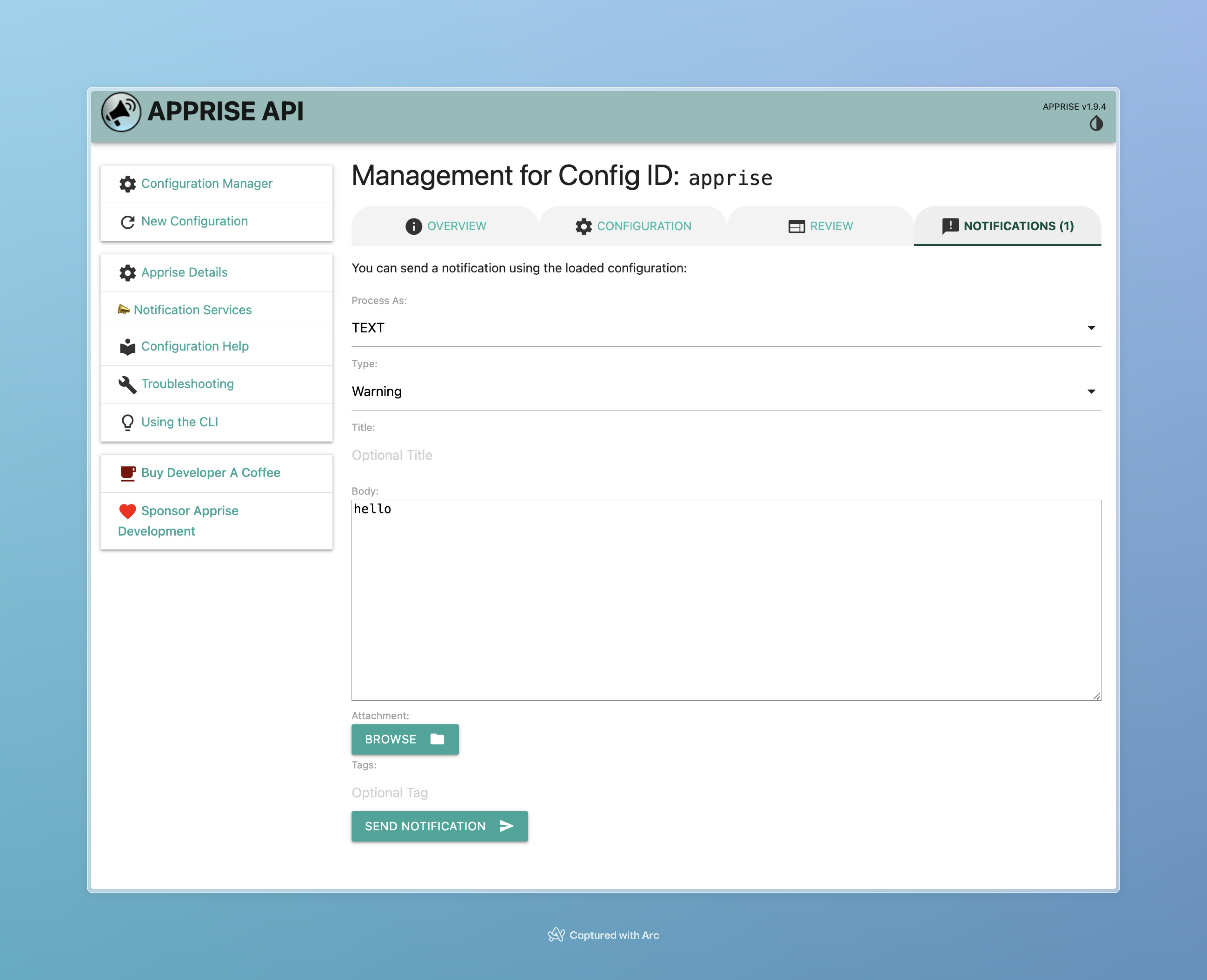 當然,如果有很多台機器都可能發送通知,那除了在所有機器上安裝 apprise 以外,也可以用 apprise 的 web 模式。