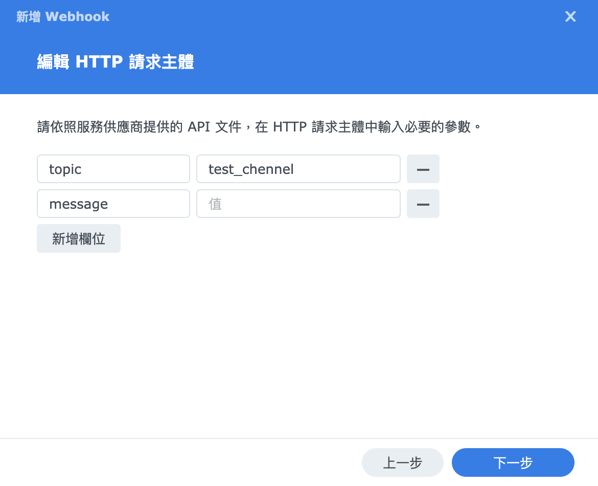 主體這邊至少要有兩個值,topic 是 chennel 的 id,message 留空。