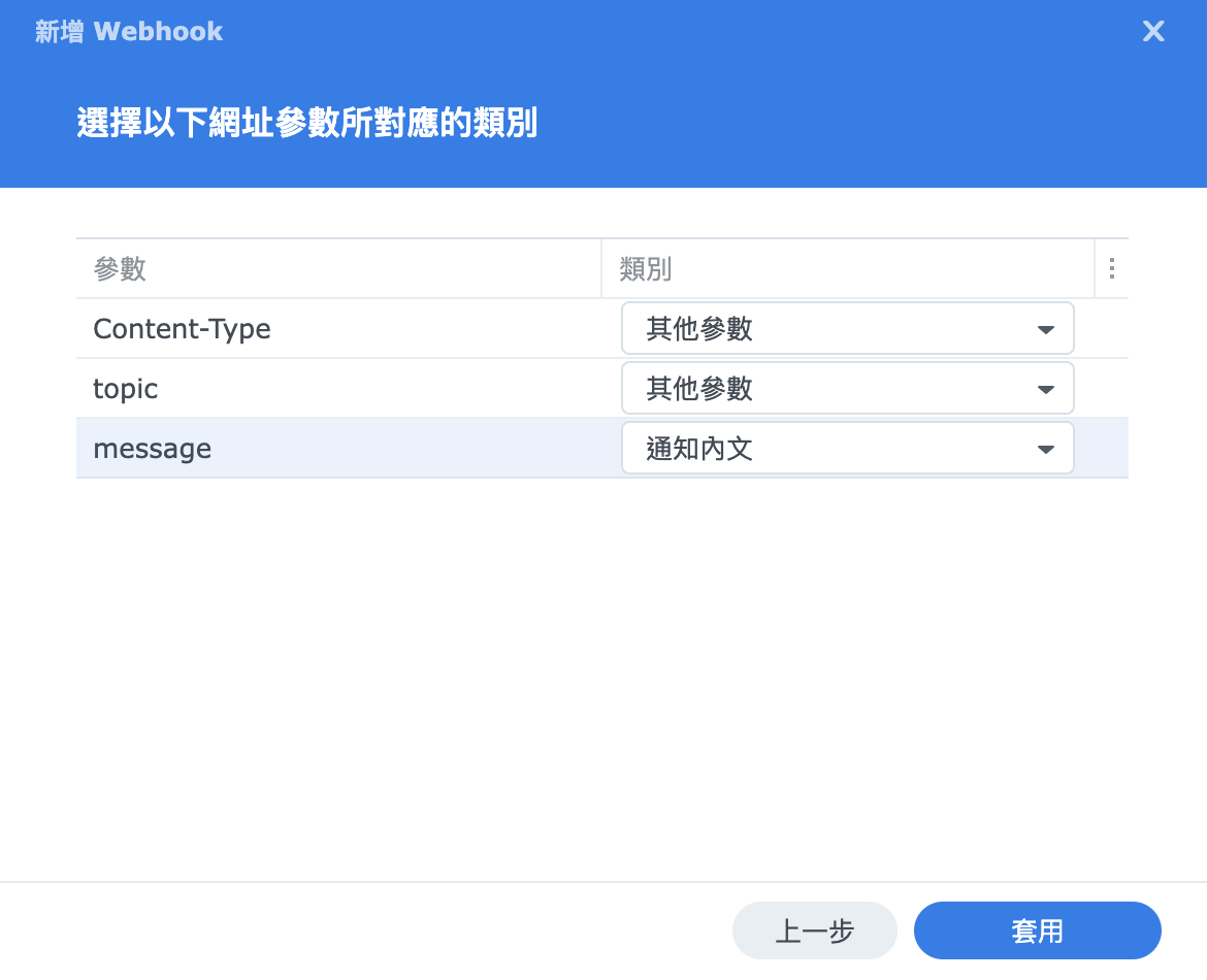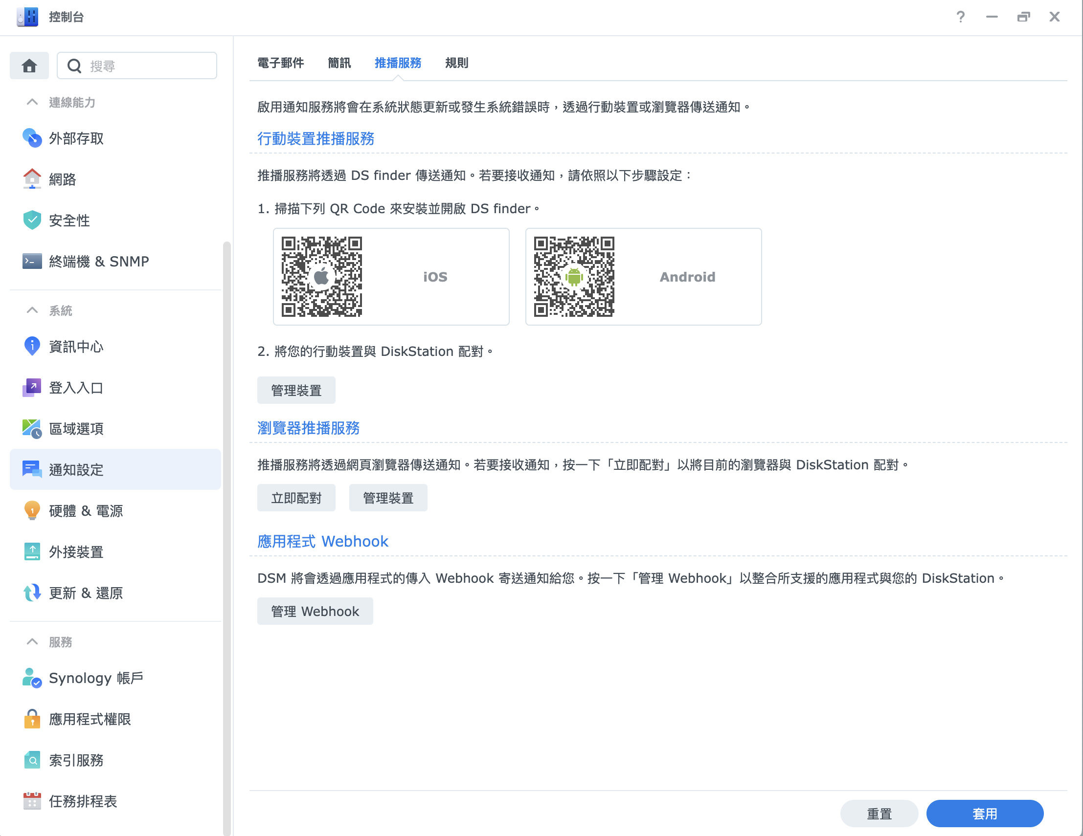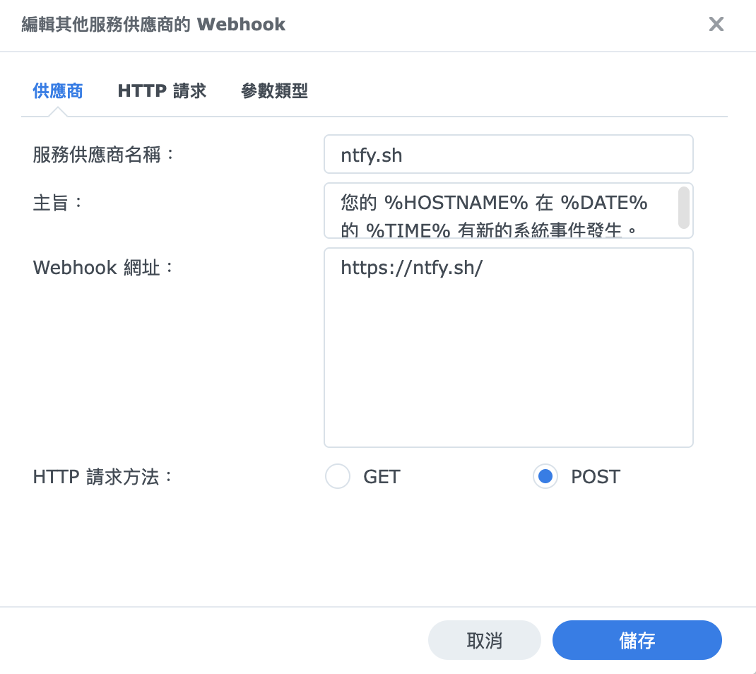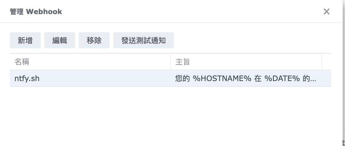 同樣我們可以設置 Synology NAS 的推波設定,把硬碟錯誤等資訊都推送到 ntfy.sh,首先到控制台 > 通知設定 > 推波服務 > 管理 Webhook > 新增。